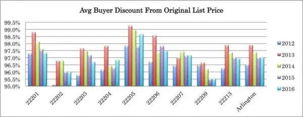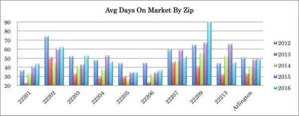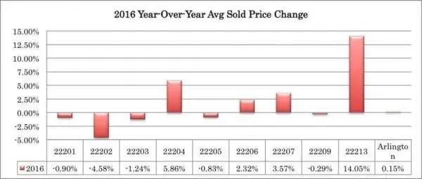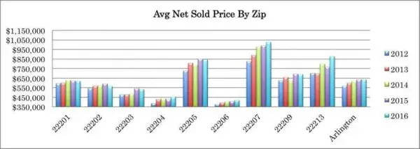Answer: Arlington continued its trend of stability and light growth in 2016 with 2,933 total transactions (just 39 more than 2015) and $1.87B in total sales volume (vs $1.85B last year). At an average net sold price (sold price less any seller credits) of $636,839, Arlington saw a price increase of .15%, while maintaining its 2015 market pace, with an average of 49 days on market per sale. The 22207 zip code continued its strong growth in 2016, cracking an average sold price of over $1M for the first time, due to the increasing number of expensive new homes replacing older teardowns.