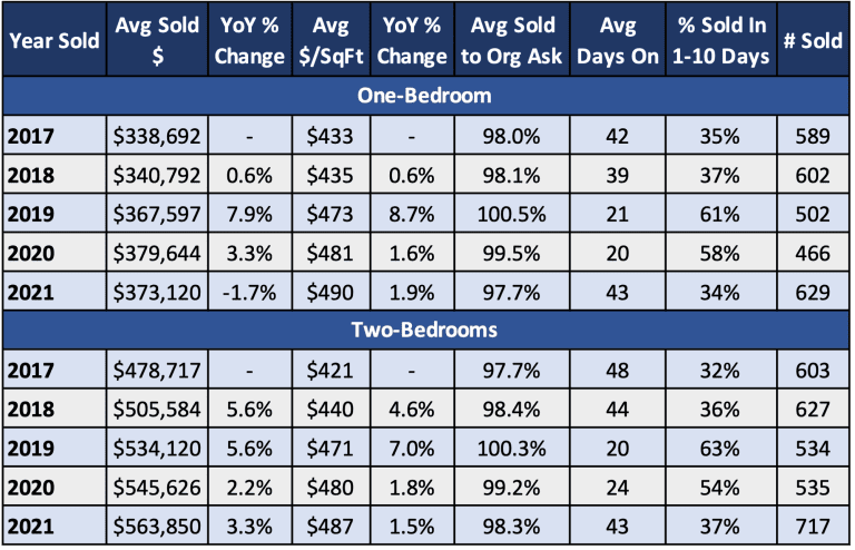 Prices from the 2019 market surge have stuck, with the average price of a one-bedroom in 2021 being 1.5% higher than in 2019 and the average two-bedroom in 2021 being 5.6% higher than in 2019. For the entire Arlington condo market, the average cost of a condo in 2021 rose 2.9% over 2019 values.
