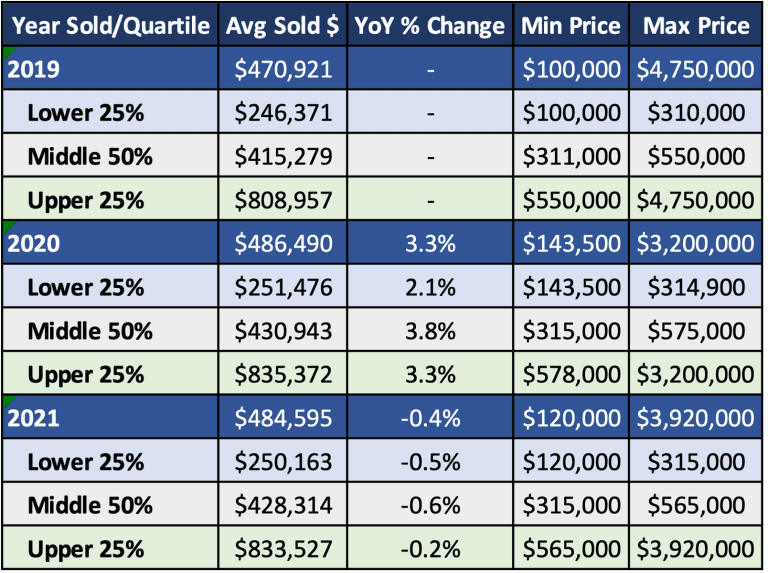 If you remove new construction condo sales, the average one-bedroom in 2021 is just 1% higher than in 2019 and the average two-bedroom in 2021 is only .9% higher than in 2019. For the entire Arlington condo market, the average cost of a condo in 2021 rose just .3% over 2019 values.