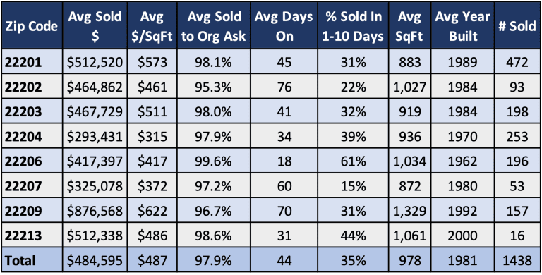 For those interested in what the condo market in each Arlington zip code looks like, I pulled together average prices, demand metrics, and property details for you in the table below.