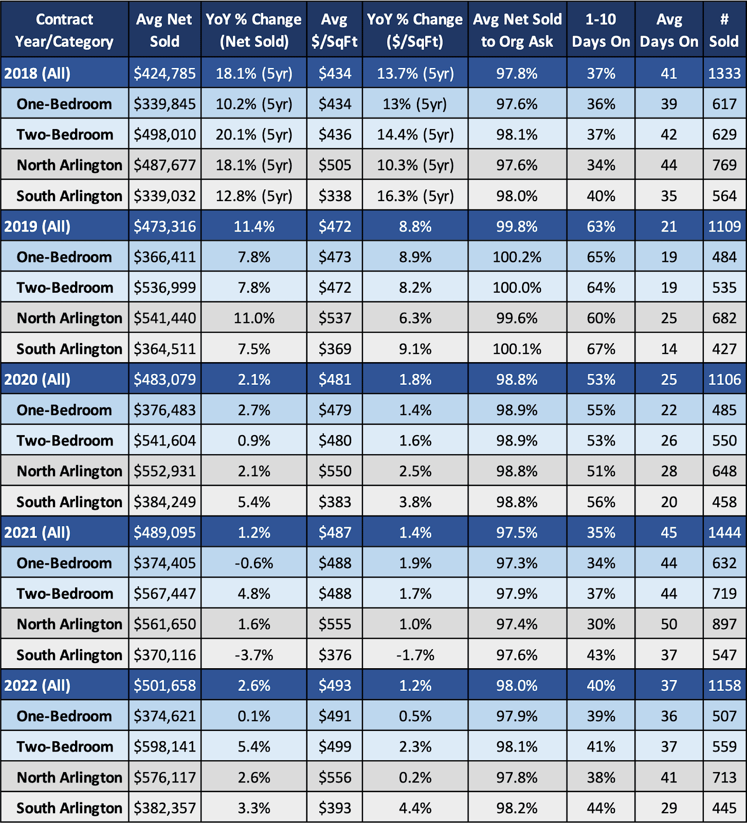 Answer: Last week, I detailed the 2022 Arlington Single-Family market performance so this week we’ll do a deep dive into Arlington’s 2022 condo market performance.