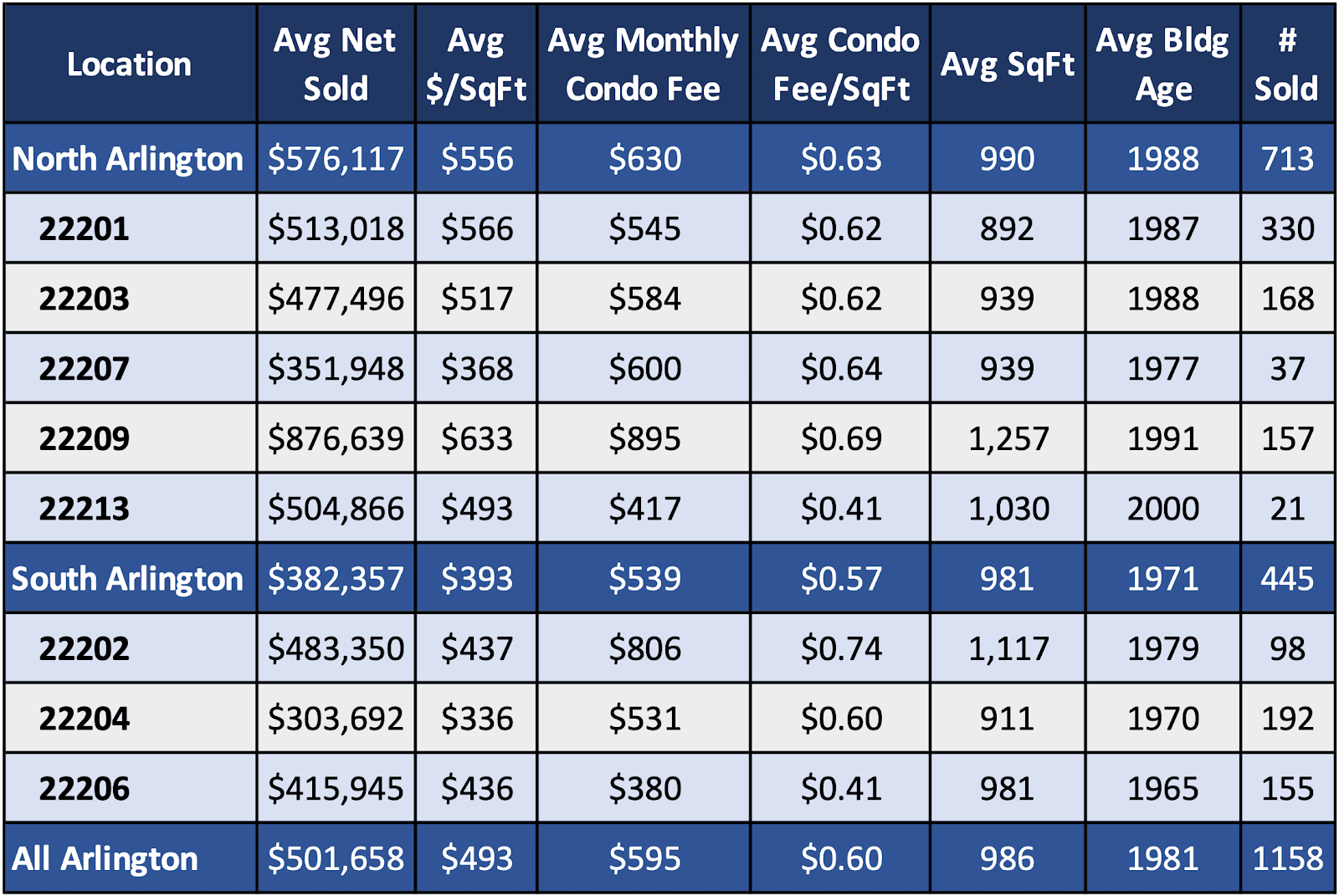The following data is for apartment-style/multi-family condos (aka buildings only, exlcuding townhouse-style condos like you see in Fairlington) and does not include age-restricted condos (The Jefferson) or Coops (Riverplace). All prices are based on net sold price (purchase price less any seller-paid closing cost credits):
