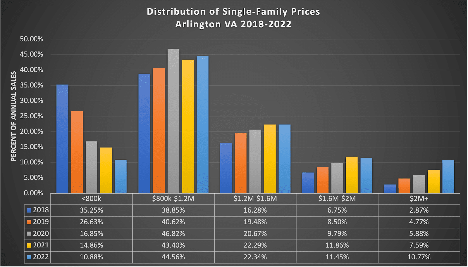 The biggest change in price distribution in Arlington has been at the ends of the spectrum, with the percentage of homes sold for under $800k dropping from 35% in 2018 to 11% in 2022. On the other end of the spectrum, the percentage of homes selling for $2M+ has increased from 3% in 2018 to 11% in 2022.