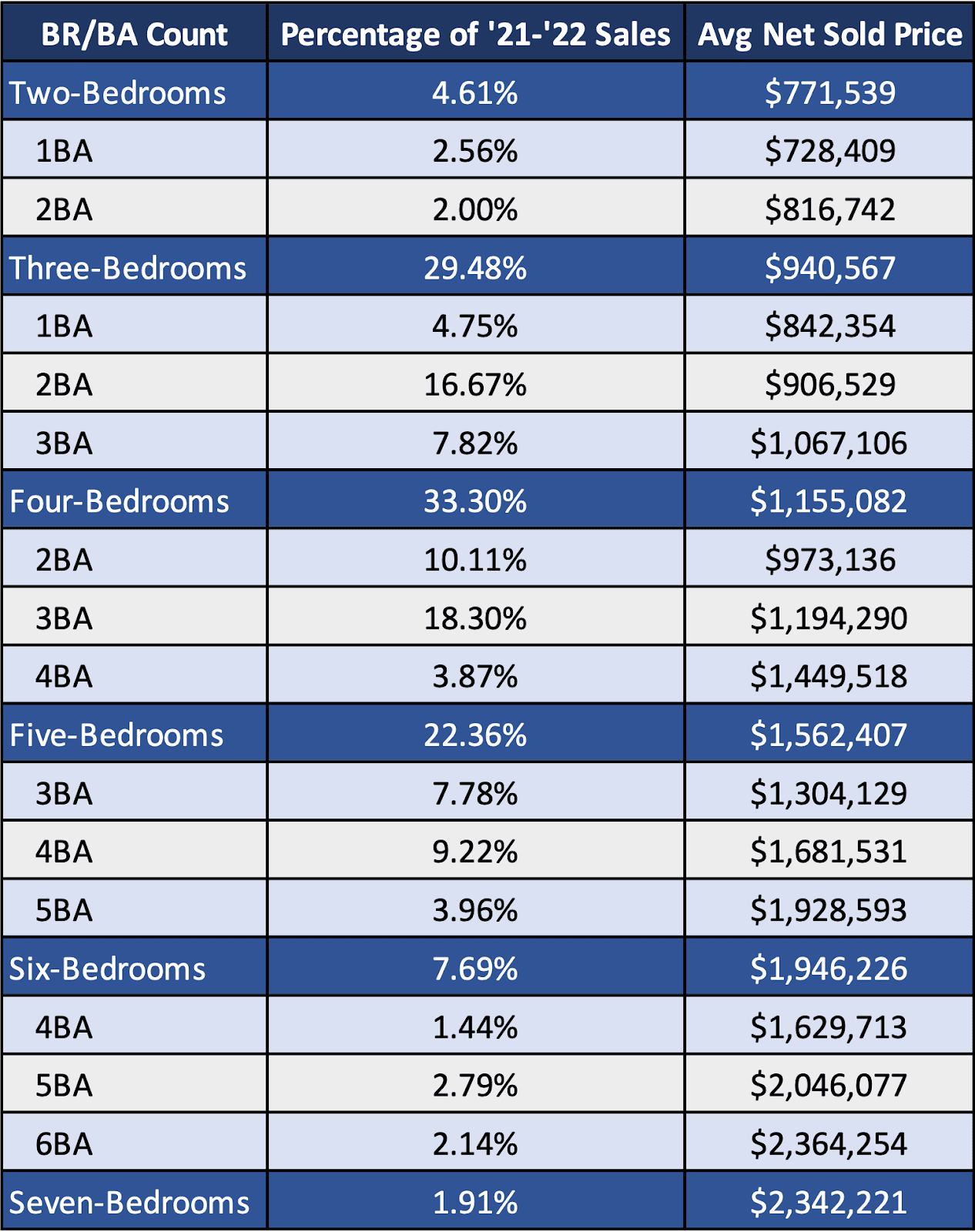 Nearly 2/3 of SFHs sold in 2022 had three or four bedrooms, most of which had at least two full bathrooms, and the price of those homes averaged $940,500 and $1,155,000, respectively.