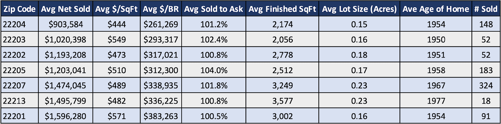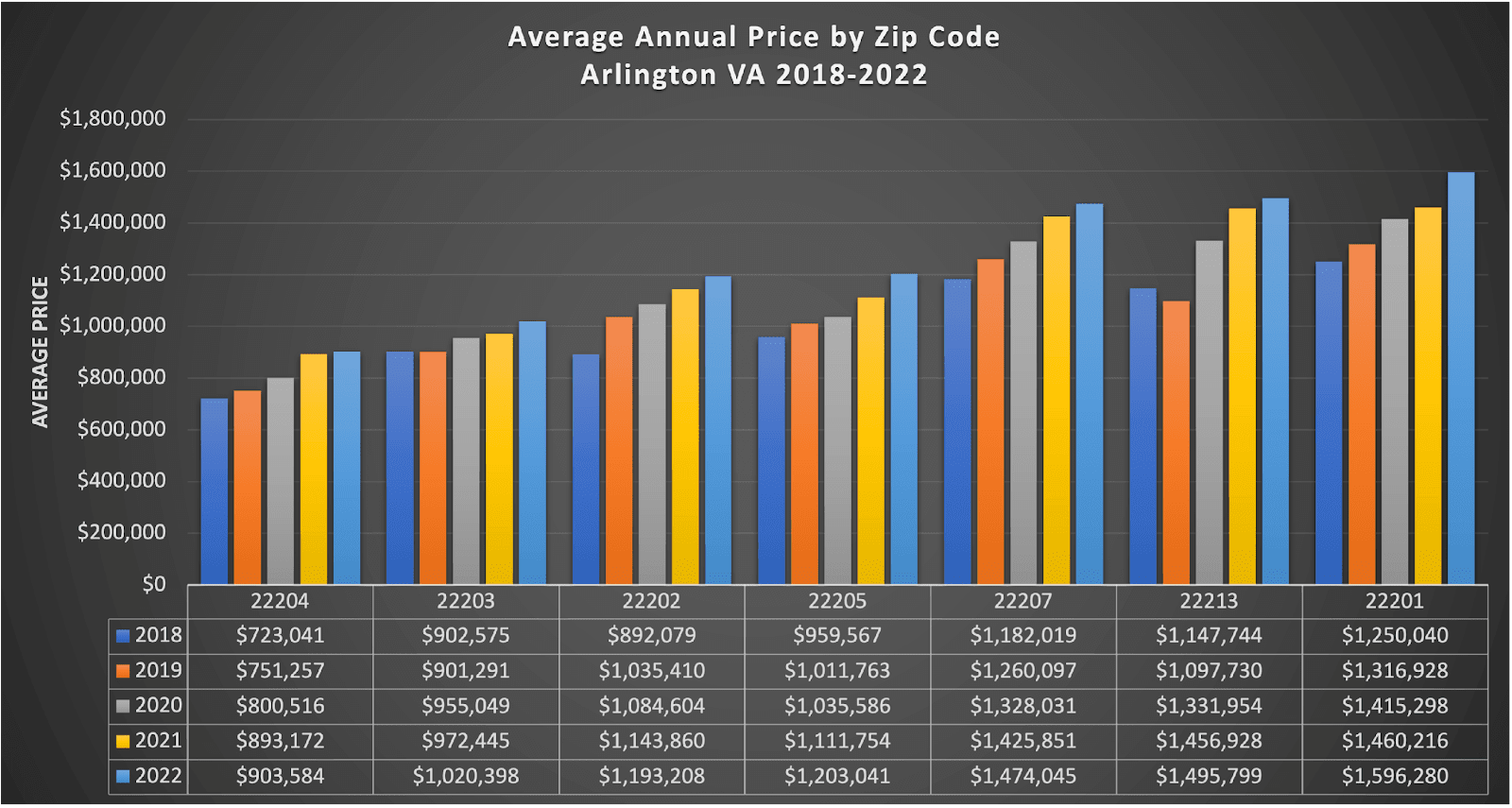 22201 and 22205 experienced the most appreciation, with YoY increases of 9.3% and 8.2%, respectively. The next highest zip code, 22203, grew by 4.9%.