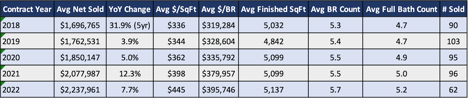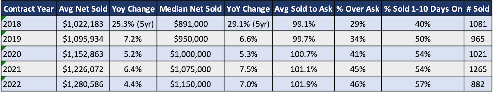 You may notice the sharp drop-off in the number of new homes sold in 2022. This drop does not align with County data for new construction starts/completions and I think is more representative of the number of homeowners building outside of what’s being offered on the market – demolishing a home they already live in, acquiring their lot and hiring a builder, or securing a lot/build with a preferred builder before it being marketed for sale.