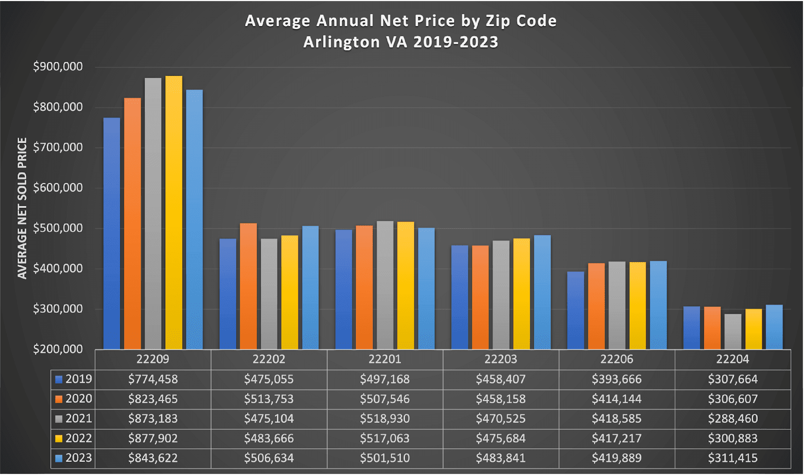 - If you remove new construction sales from the data, the zip codes with the strongest five-year average price increase are 22206 (6.7%) and 22202 (6.6%).