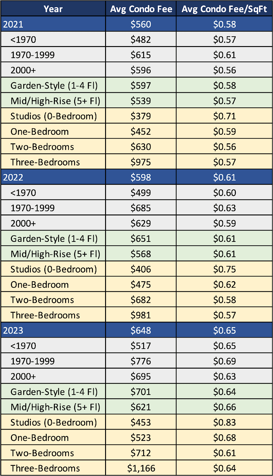 For those of you who have taken the important and thankless job of being on your Condo Board or being part of your Finance Committee (thank you!), I’ve organized condo fee trends across Arlington over the past three years to help you gauge your fees against the market. In most cases, there is an inverse relationship between condo fees and market values in your building; higher fees result in downward pressure on market values. There are of course exceptions to that, like luxury buildings with high-end amenities and higher staff counts.Over the past two years, the average condo fee has increased by about 16% and the average condo fee/SqFt has increased by 12%. Normally, this would be alarmingly high, but it makes sense given the pace of inflation during the period. Generally speaking, the goal for communities should be to hold condo fees steady relative to inflation (2-3% annual increases) which makes sense because condo fees are essentially the sum of goods and services used by the Association, divided amongst each unit.