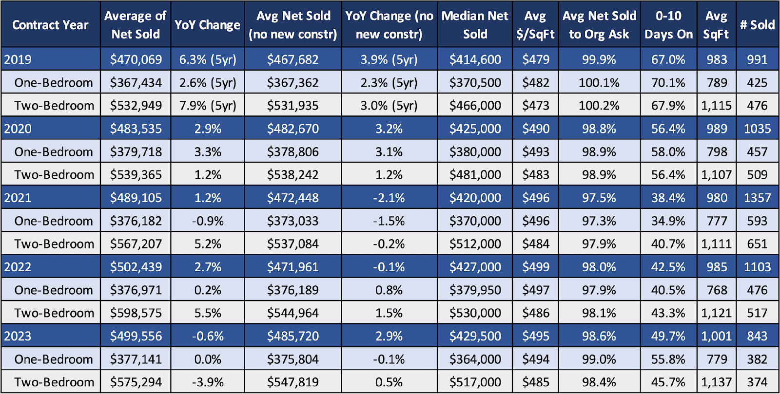 - If you remove new construction sales from the data, the average price of a condo increased 2.9% in 2023, but if you drill down into price change by condo size, the average one-bedroom condo. dropped .1% and the average two-bedroom condo increased .5%.