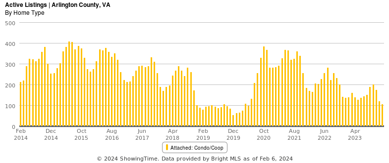 After an up-and-down few years from 2019-2021 (up from Amazon HQ2 announcement, down from COVID), the Arlington condo market has returned to its natural form – slow and steady. Depending on how you slice the data, the condo market is either up or down slightly in 2023 compared to 2022 so it’s fair to say that condo prices were mostly flat in Arlington last year.- The average price of a condo in Arlington fell by .6% in 2023, while the average $/SqFt fell by .8%, and the median price of a condo increased by .5%.