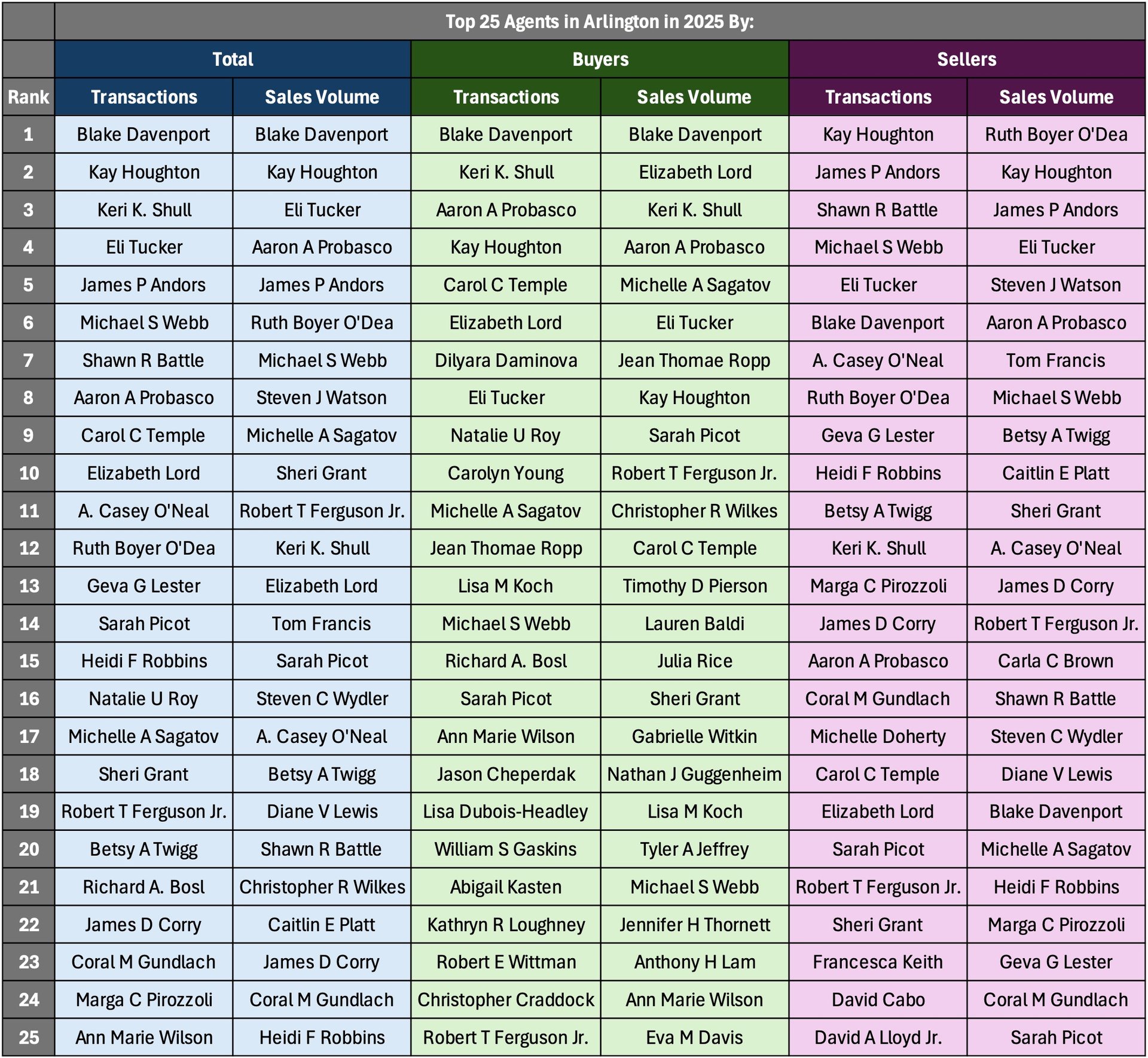 Below are some interesting highlights for 2025 real estate agent transaction/production data in Arlington: