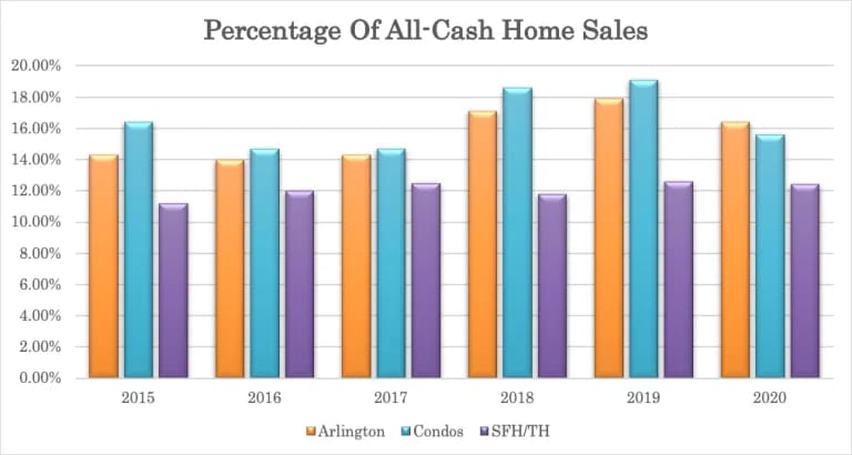 The chart below shows the percentage of homes sold in Arlington that were bought by all-cash buyers since 2015, also broken out by condo and single-family/townhouse purchases.