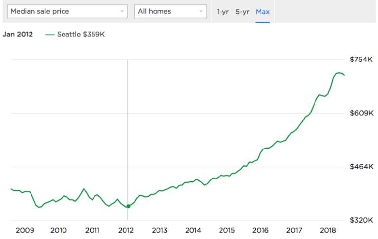 To get a sense of what could happen to the housing market over time, let’s take a look at the Seattle area since Amazon started taking off in 2012. Remember, with a company like Amazon, it’s not just their employees but the employees of companies with direct and indirect business relationships.