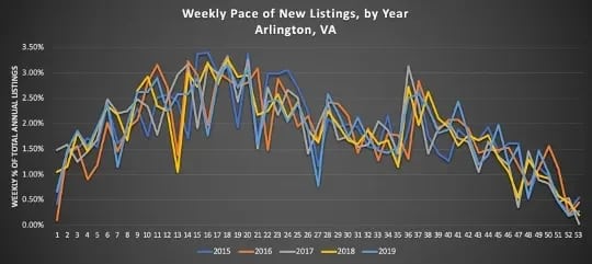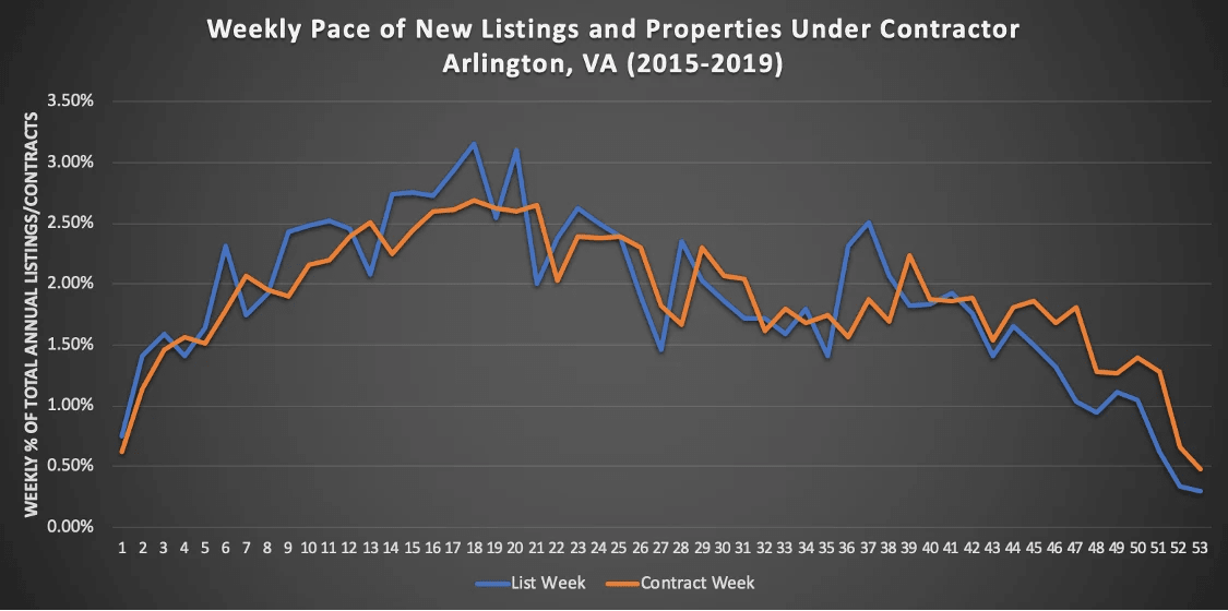 The following chart does just that and pulls data from the five years spanning 2015-2019 (I threw out 2020 because it’s an anomaly). The weekly percentages represent that week’s share of total annual listings. Note that the data for the first and last weeks of the year aren’t always full weeks because of how Excel calculates weeks.