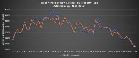 I’ve always shared and seen monthly breakdowns of listing inventory, so I thought it would be interesting to break it down a bit further into a weekly chart and see if there’s a noticeable difference in the seasonal pace of new listings of single-family homes/townhouses and condos.