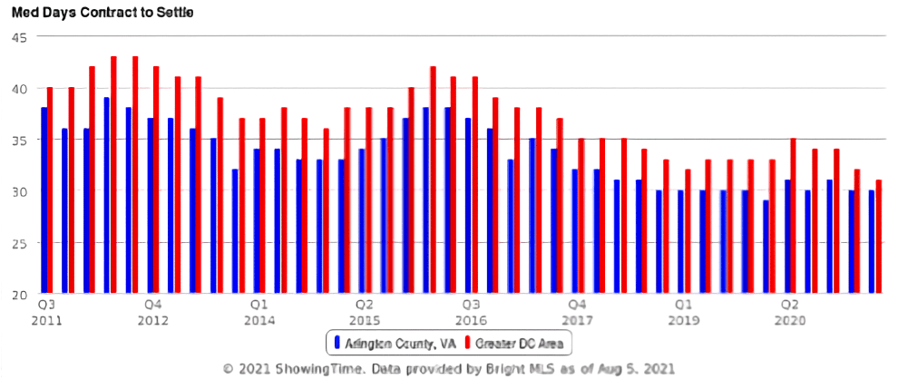 The median contract-to-close period in Arlington has been ~30 days since 2018, down from ~36-38 days a decade ago. Most sellers want to close as quickly as possible, so buyers who can close faster have an advantage. Be sure to talk to your lender about how long they need to close before signing off on your offer. Some bigger, national banks and credit unions often need 35-40+ days to close. Many of our local lenders can comfortably close in as little as three works (sometimes even faster).