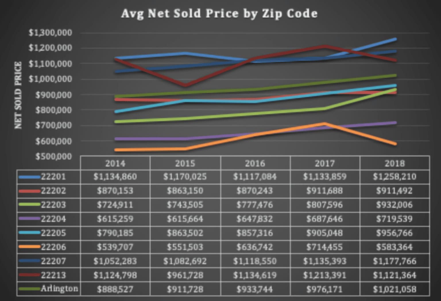 The prices below represent the net sold price calculated by subtracting any seller-paid closing cost credits against the sold price. 22206 and 22213 have relatively few sales, so averages aren’t reliable and I removed 22209 (two detached sales).