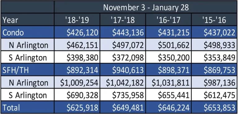 - Prices Are…Down?: To draw a high level of confidence in a data set, data scientists generally recommend collecting at least 30 samples. With 350 sales (samples) of Arlington homes having gone under contract since November 3, you’d think that I’d be confident in the conclusion highlighted in the data set below which shows a decrease in the average sold price of Arlington homes that went under contract from November 3 – January 28.