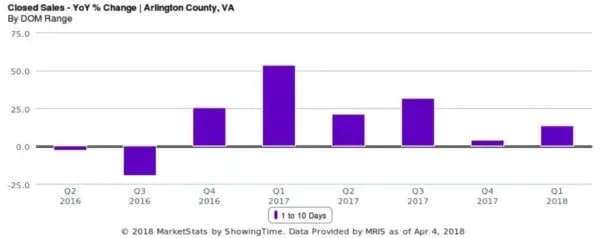 This chart shows the YoY change in the number of homes sold within the first 10 days on market, which has increased the last six quarters in a row. There was an impressive 53.4% YoY increase from Q1 2016 to Q1 2017, followed by yet another double digit increase in homes sold within the first 10 days from Q1 2017 to Q1 2018.