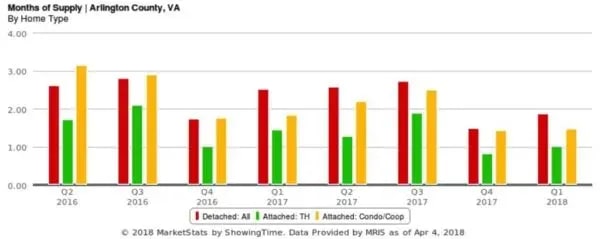 Months of supply measures how long the existing housing inventory would last given the last 6 months of demands (absorption). Most economists say that 4-6 months of supply represents a well-balanced housing market and Arlington has hovered around 1.5 months of supply for the last 6 months.