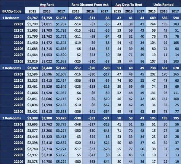 The least expensive rentals are in the 22204 zip code because there are not any walkable metro stations and the housing inventory tends to be substantially older