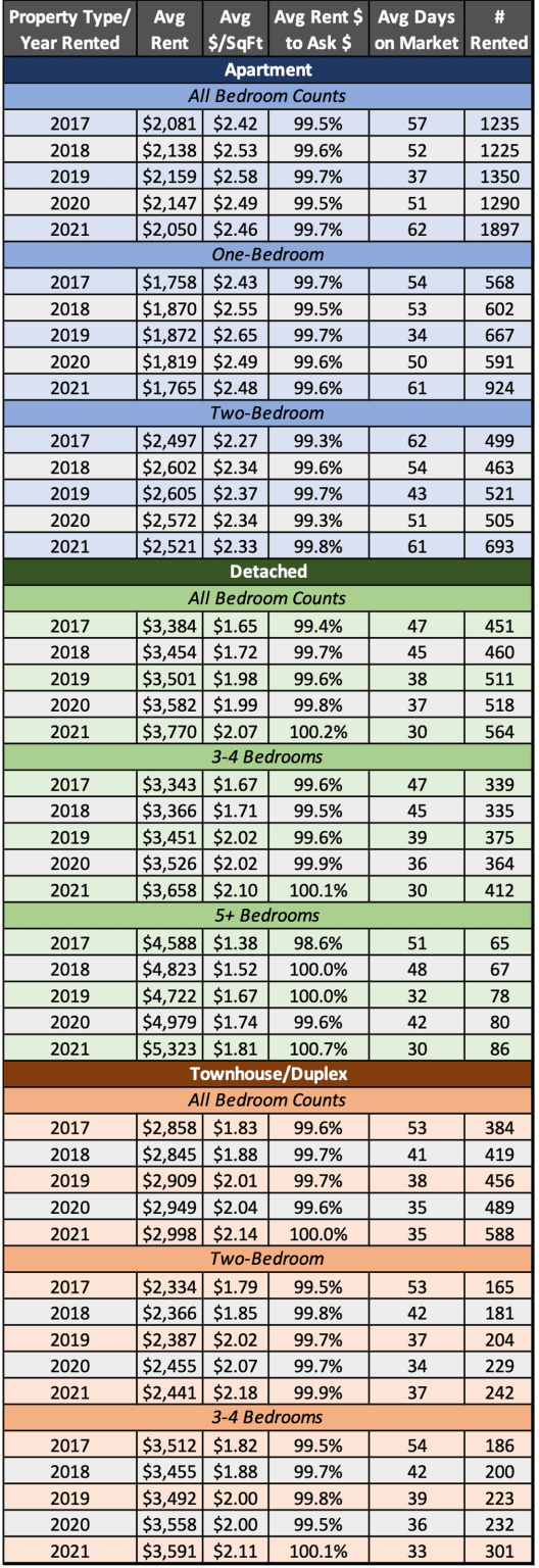 Below, I’ve compiled rental data from the MLS in Arlington over the last five years. Note that very few commercial apartment buildings list in the MLS so this data is limited to non-commercially owned rentals (for apartments, that is mostly individually owned condos).