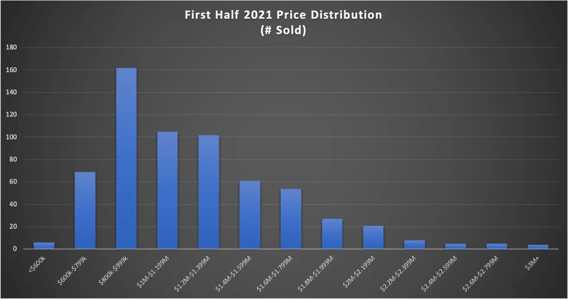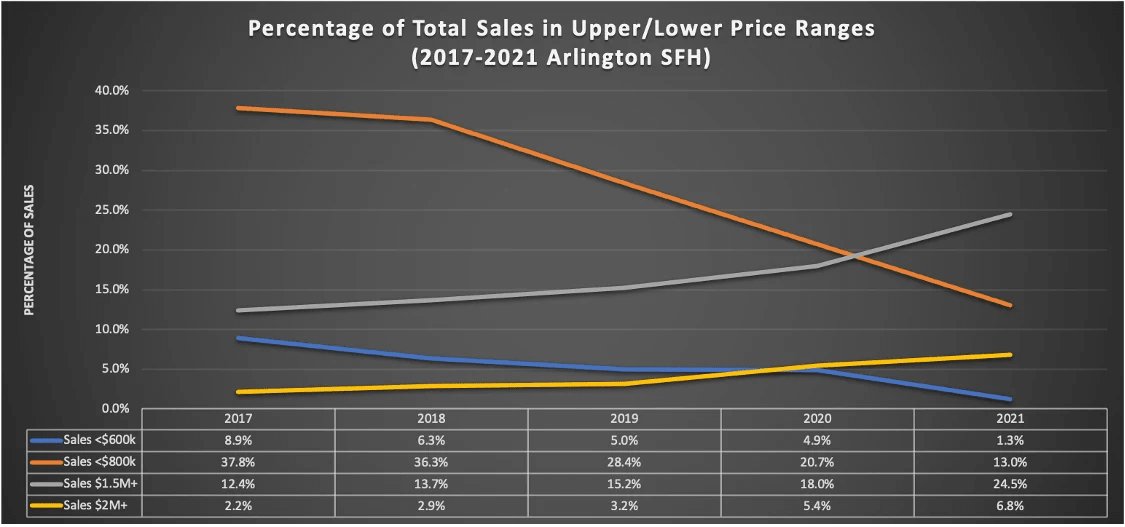 While the largest volume of sales still falls in a sub-$1,000,000 range, the price distribution in Arlington skews high. Despite the high average/median prices, Arlington doesn’t have much of an ultra high-end market, with just three sales over $3M and just two SFH sales over $3.5M in the last five years.Prior to this year, the percentage of sales under $800k was always greater than the percentage of sales over $1.5M. In the first half of 2021, not only were there a higher percentage of sales over $1.5M but the number of sales over $1.5M nearly doubled the number of sales under $800k!