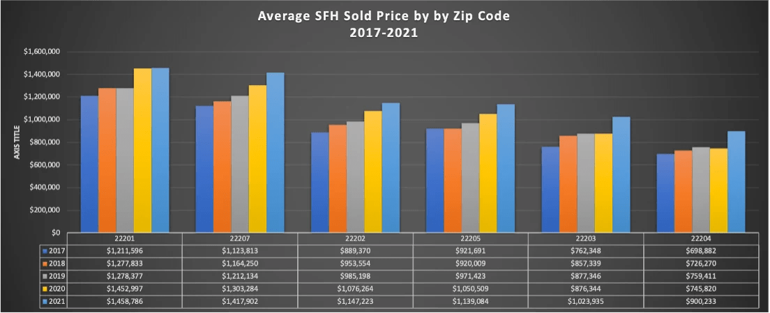 Of the six zip codes with enough SFH supply to generate reliable data (22206, 22209, and 22213 don’t have enough SFH sales), only one had an average sold price below $1,000,000, compared to four in 2019!One of my biggest takeaways from the 2021 market so far is just how quickly prices have increased in the least expensive neighborhoods. The two zip codes with the lowest average SFH price, 22203 and 22204, increased by 16.8% and 20.7%, respectively, from the first half of 2020, while the four most expensive saw increases ranging from .4% to 8.8%.
