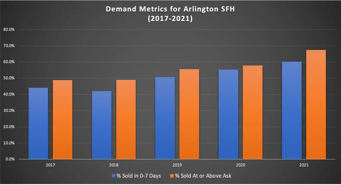 Arlington had more time than other markets to adjust to such intense demand because the market really took off after Amazon announced plans for HQ2 in November 2018, but the pressure of COVID and low interest rates have intensified that demand.The number of homes sold within one week and the numbers of homes sold at or above the asking price both exceeded 60% of total sales for the first time.