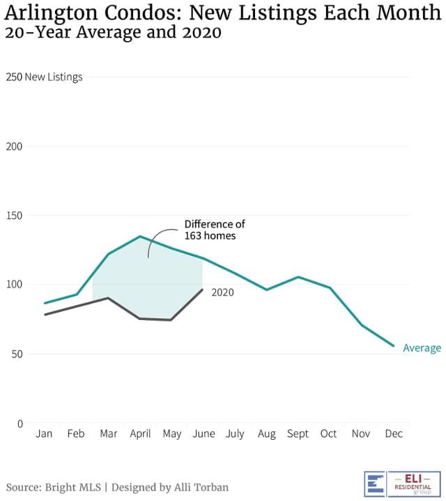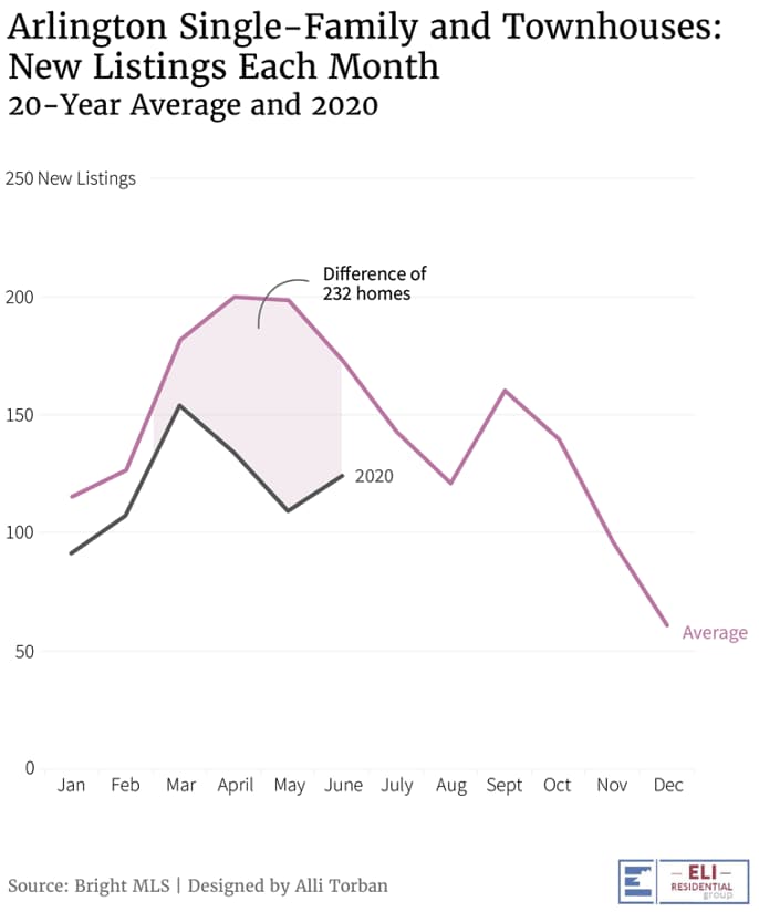 Like everything else in 2020, housing inventory suffered tremendously during the COVID-19 outbreak and associated lockdowns. In the months prior to COVID-19 (December-February) the number of new listings seemed to be on track to return to, or close to, our 20-year average after a down year in 2019 (due to the Amazon HQ2 announcement). However, from March-June 2020 we ended up down 232 single-family/townhouse listings and 163 condo listings compared to the 20-year average.