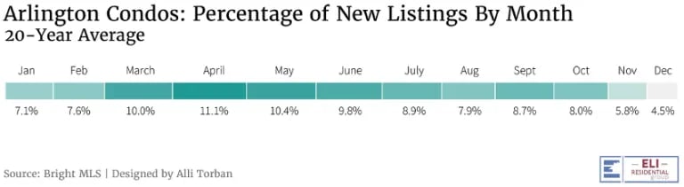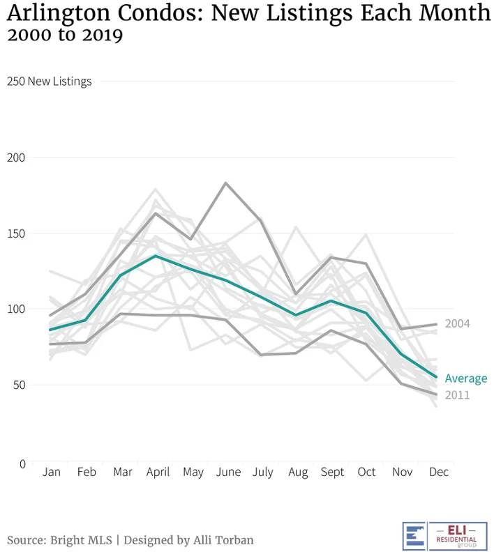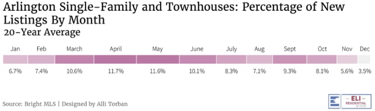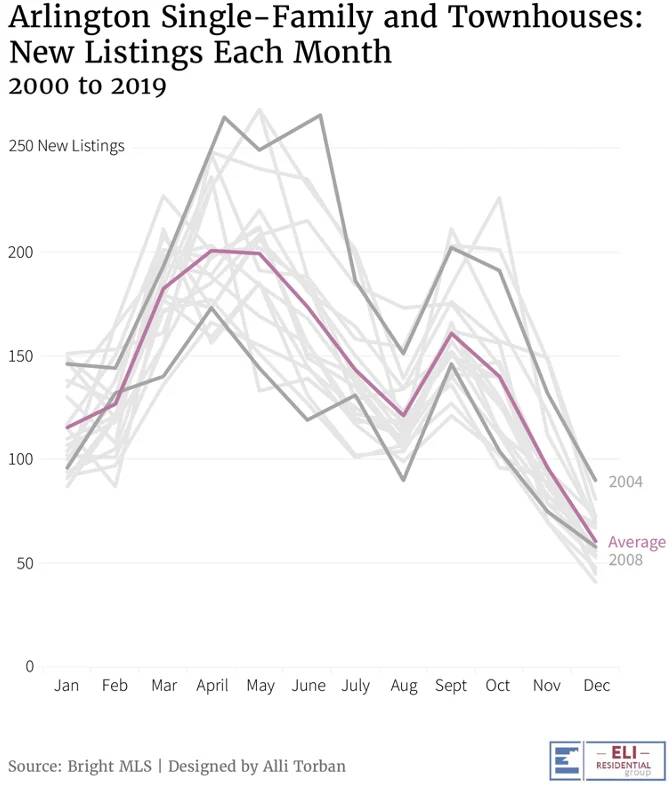The pace and distribution of new inventory in Arlington has been pretty consistent over the last 20 years. Inventory peaks in the spring, with about 1/3 of new listings hitting the market from March-May and then steadily declines to annual lows during the holidays, with a slight “fall bump.”
