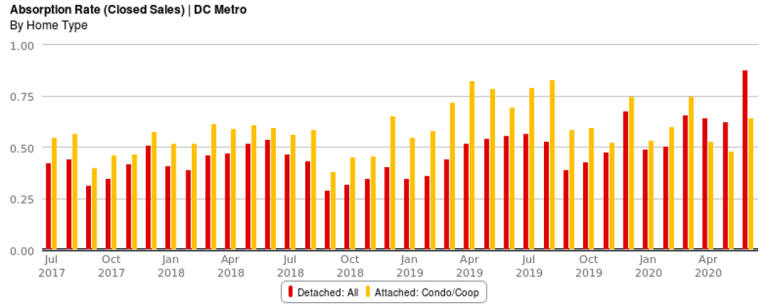 Looking further down the road at the end of 2020 and into 2021, the key metric that will determine how prices react is the absorption rate – the rate of homes sold vs the number of homes being listed for sale. A rate above 1.0 means that demand is outpacing new inventory and there is significant upward pressure on prices. Economists look for an absorption rate of ~0.2 for a balanced market, and the higher the rate, the more favorable the market is for sellers.
