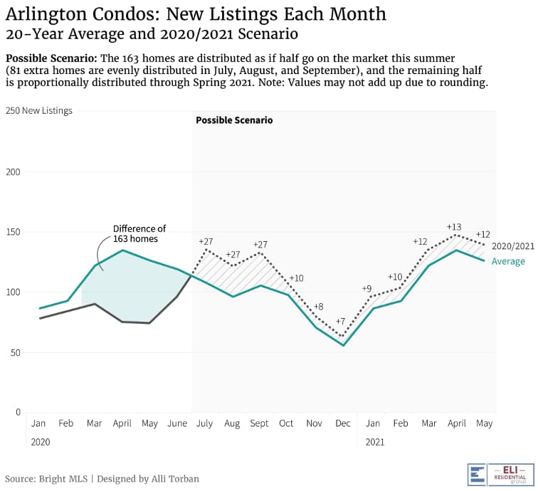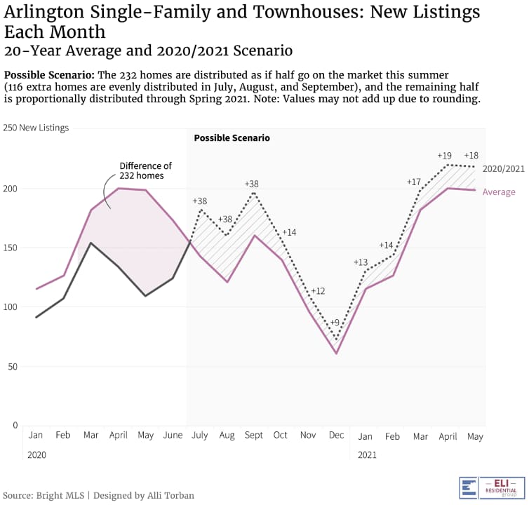 The charts below illustrate what new listing volume might look like if half of the homes that were held back from the spring market are released onto the market from July-September and the other half is distributed in-line with the historical monthly distribution through spring 2021.