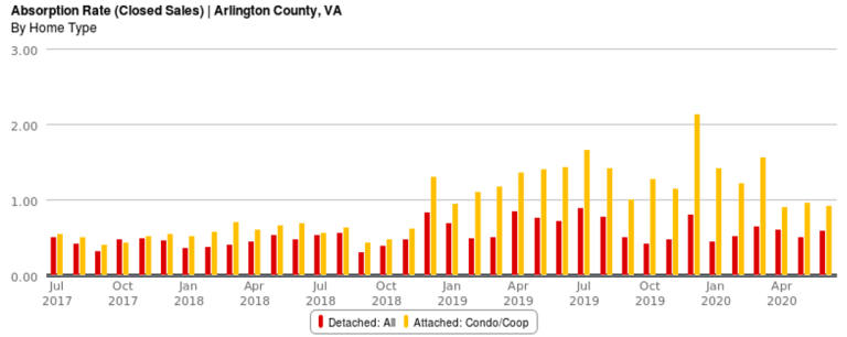 Below is the monthly absorption rate for single-family detached homes (red) and condos (yellow) in Arlington and the DC Metro. Note that Arlington’s detached absorption rate is a bit higher if you remove new construction (unfortunately I can’t customize it in this case) and that the Northern VA market is very similar to the DC Metro market.