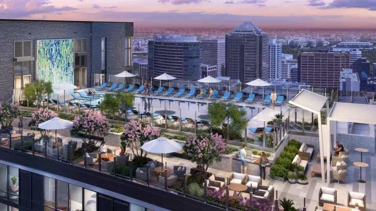 Top Amenities: 24-hour staff, rooftop pool, two-story gym, and club room, to name a few