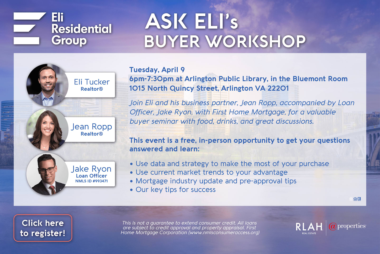 On Tuesday April 9, I’ll be hosting another Ask Eli Home Buyer Workshop with my business partner Jean Ropp and local Loan Officer, Jake Ryon, with First Home Mortgage. Food and drinks will be provided!
