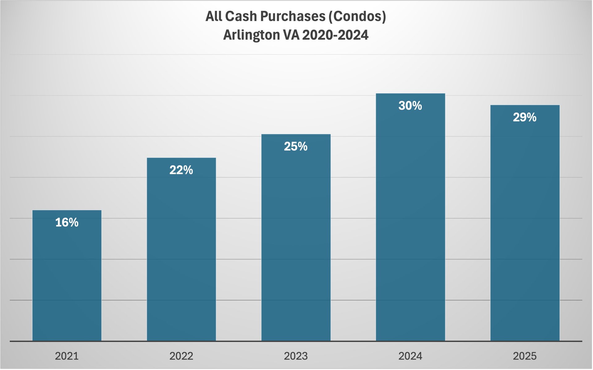 At least ¼ of Arlington condos were purchased with all cash, for a third year in a row. The trend towards cash is directly correlated to higher borrowing costs since the summer of 2022.