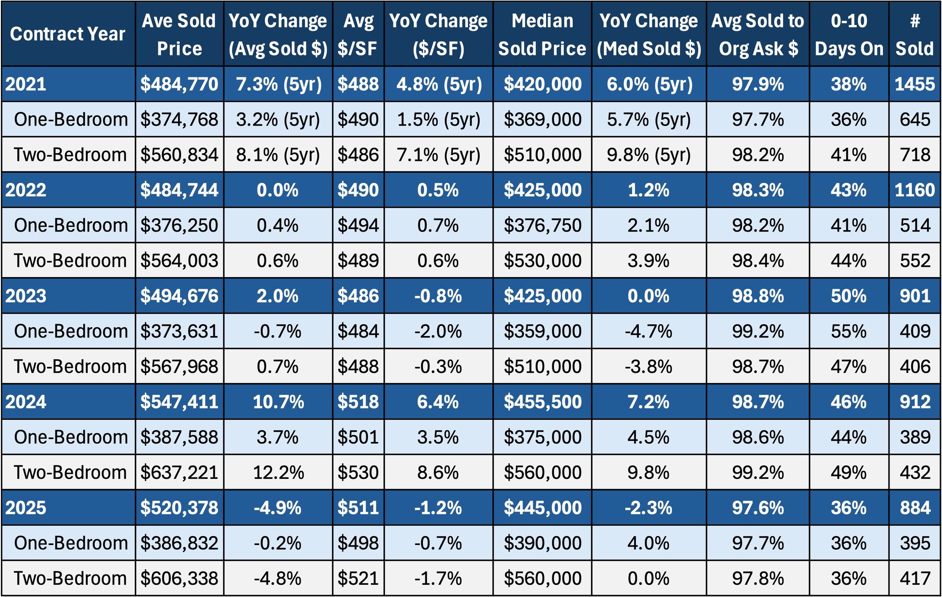 The 2025 condo market was (slightly) slower and buyers had (slightly) more negotiation leverage than even 2021, when the market was reeling from the COVID flight out of multi-family living. Let’s dig in: