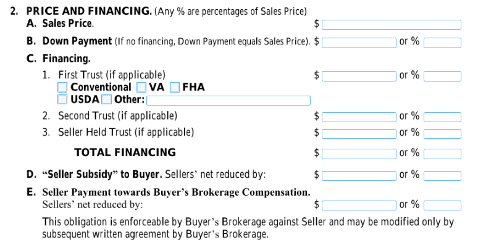 As of July 1, the Northern Virginia Association of Realtors released new forms that agents in Northern VA will be using and among the many changes (non-commission changes detailed here), the most significant for consumers is the addition of Section 2E in the sales contract, shown in the screenshot below, which adds a line for “Seller Payment towards Buyer’s Brokerage Compensation.” Of note, the Greater Capital Area Association of Realtors (GCAAR), which handles forms for DC and the Maryland Suburbs, has not released their new forms yet.