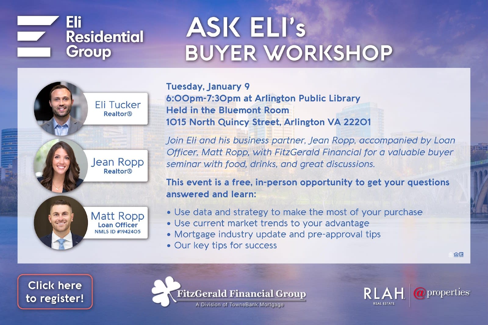 On Tuesday, January 9, I’ll be hosting another Ask Eli Home Buyer Workshop with my business partner Jean Ropp, and Loan Officer, Matt Ropp, with FitzGerald Financial. Food and drinks will be provided!