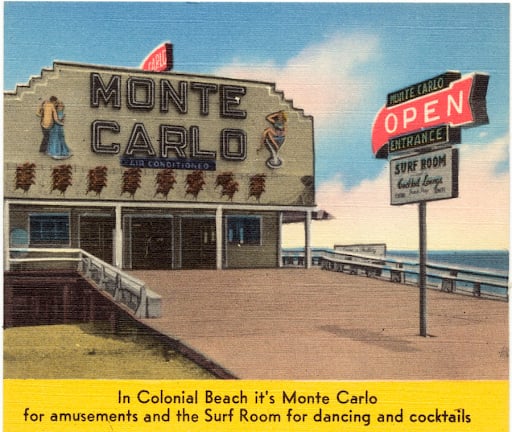 By 1949, Colonial Beach was more akin to Monte Carlo. The legalization of slot machines in neighboring Charles County, Maryland transitioned Colonial Beach from its “resort vibe” to its “casino-era.” Businessmen, once again, saw dollar signs. Virginia-side wharves were built featuring small casinos at the end of piers in the Maryland-owned Potomac waters. A large barge, dubbed “Pleasure Island”, acted as a floating gaming house of slot machines, pulling both Virginians and Marylanders offshore to press their luck. By 1958, Virginia councilmen convinced Maryland to amend its slot-machine laws, barring any use of machines unreachable from Maryland soil. This ultimately ended this high-stakes period.