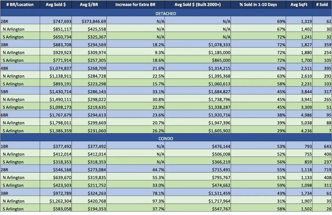 Answer: The primary criteria for most buyers is the number of bedrooms, so this week we will break down the cost of detached and condo housing in Arlington by bedroom count. The dataset includes all closed sales since Jan 1 2020 except a $45M sale, River Place Coop, and age-restricted housing. Below are some highlights from the data: