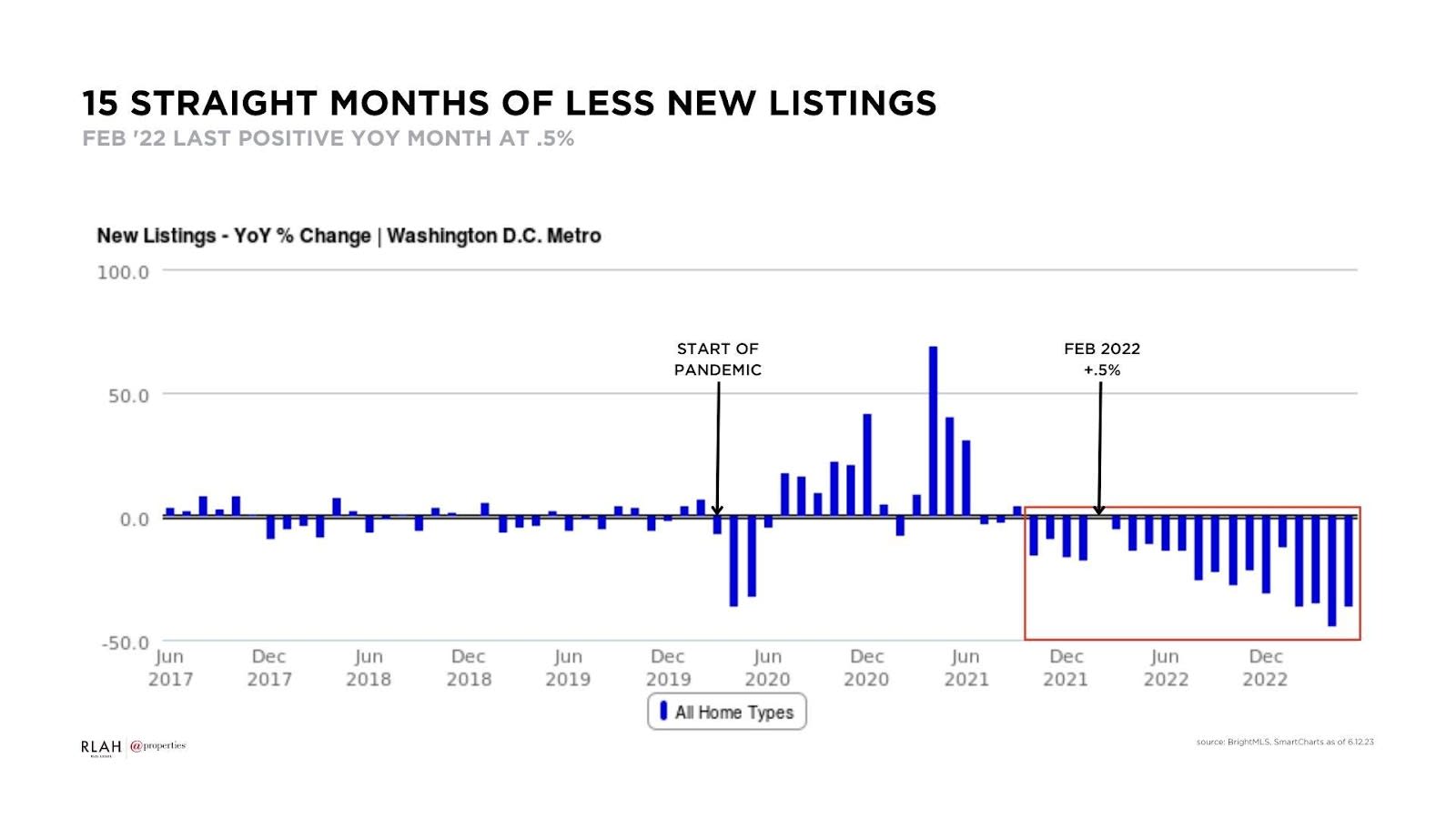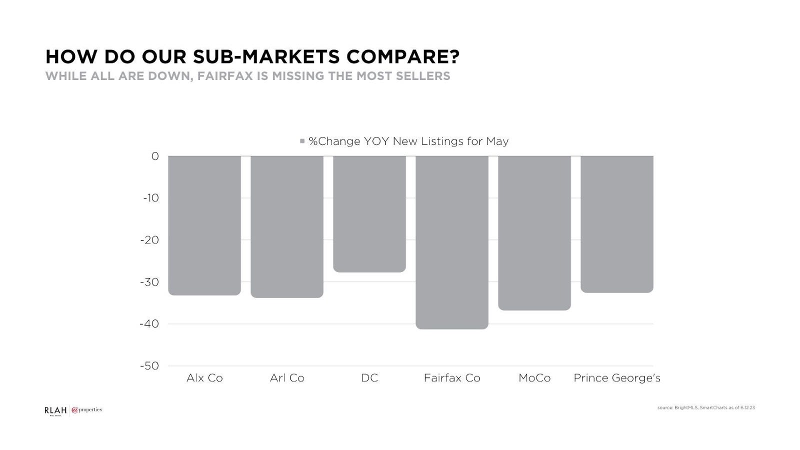 Chart #3: All DC area submarkets are desperate for new listings, but Fairfax Co. has it the worst with a drop in new listings volume by more than 40% year-over-year. DC has had the lowest drop but it’s still down by nearly 30%.