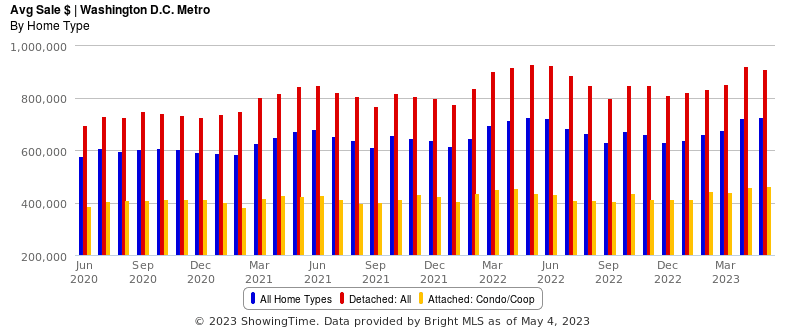 Condo prices are up 6.2% year-over-year in the DC Metro, whereas single-family detached are down -2% year-over-year because the May 2022 condo market was still softer due to COVID-related shifts in demand (dropped for condos) and supply (huge condo sell-off) while the single-family detached market was on fire during at that time.