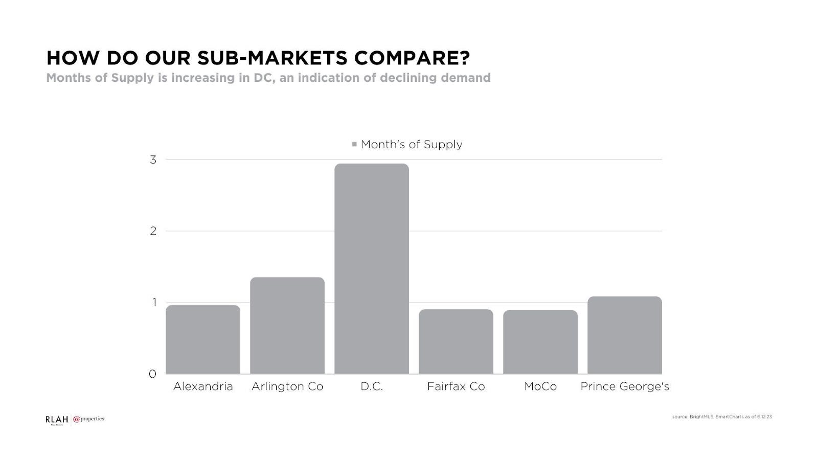 Demand has fallen everywhere compared to 2021/early 2022, but the drop in supply has been greater in most sub-markets than the drop in demand, which has kept market values up. However, Months of Supply, a metric that measures demand against supply, is on the rise in DC indicating that demand is falling faster than new listing volume and putting light downward pressure on prices.