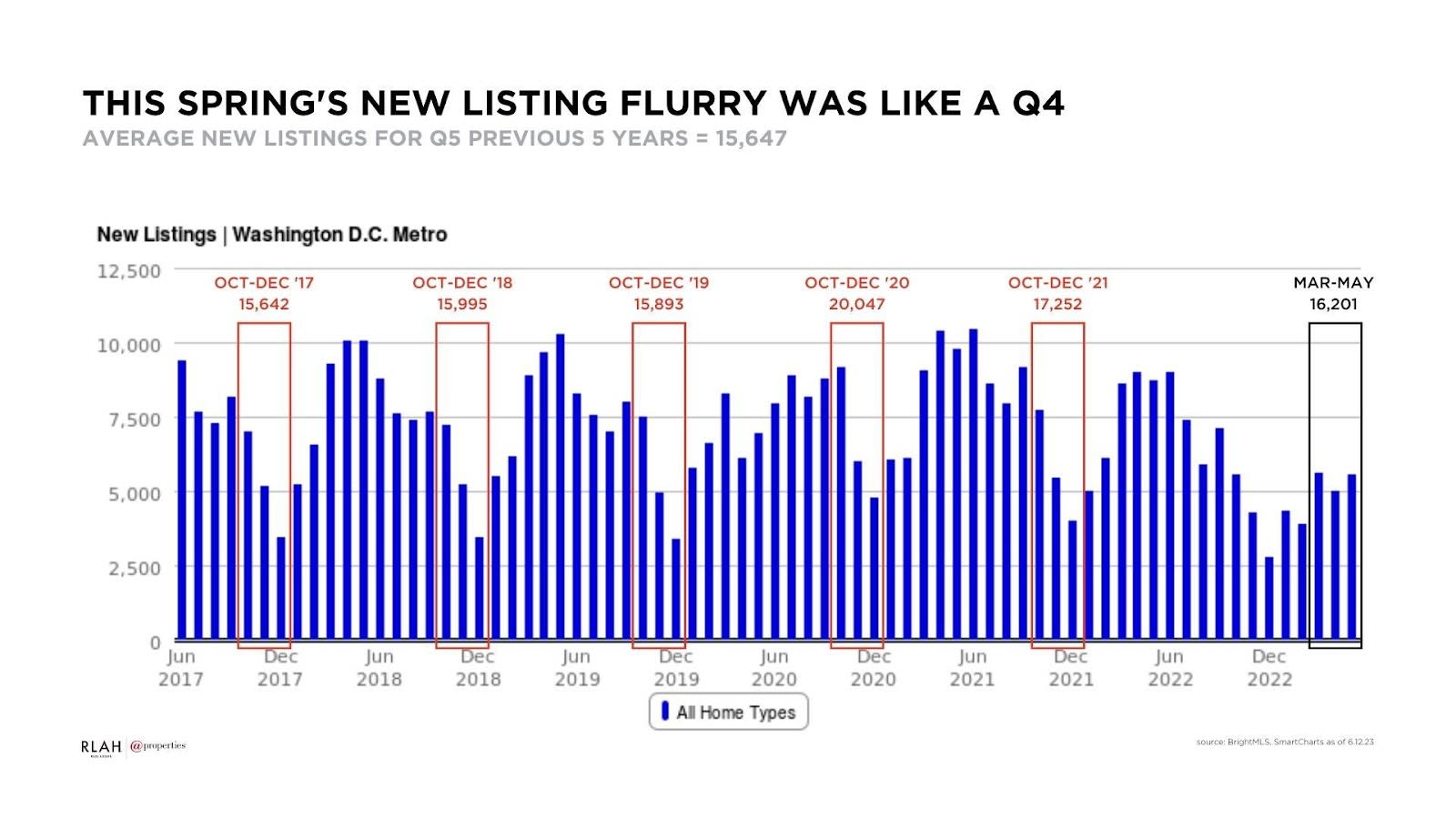 Chart #1: One of the most interesting charts I’ve seen below compares this spring (Mar-May) to the previous Oct-Dec new listing volume. Historically, we see the least number of homes listed for sale during the 4th quarter of each year and the most homes listed for sale Mar-May each year. New listing volume has been so low in 2023 that Mar-May 2023 has a similar listing volume to what we usually see from Oct-Dec.