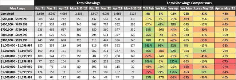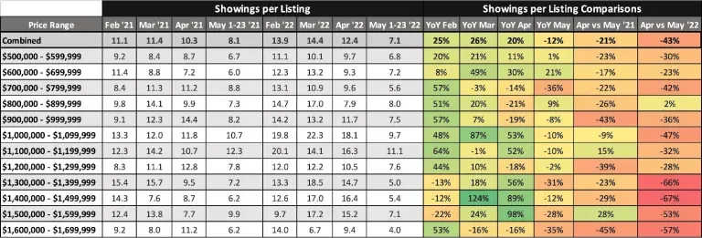 I pulled data on total showings and showings per listing for Feb 1-May 23 2021 and 2022 on homes priced from $500k to $1.7M, with combined data for all price points at the top of each table. For those not interested in examining the data in detail, here are the highlights: