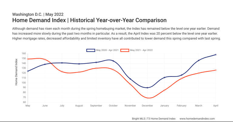 Below you will see the Bright MLS Home Demand Index for the DC area. From July 2021 through February 2022, demand trailed its year-over-year (YoY) counterpart and even came close to matching the YoY demand reading in February 2022. However, you’ll see a noticeable separation in YoY demand taking place in March and especially April. I expect these lines to separate even further in May.