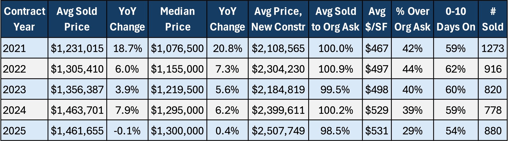 I expect 2026 data to look like 2025, with prices mostly flat, ~50% of homes selling within ten days, limited negotiation leverage for buyers, and less than one-third of homes selling over asking.
