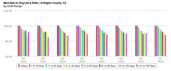 Days on Market: Days on Market (number of days a property has been listed for sale) is a great place to start when discussing a discount from list price. The longer a home sits without a contract, the higher the opportunity for a discount from the list price. I’ll let the following graphic of quarterly home sales in Arlington explain. Note: 100% means the buyer paid full ask, 95% means they paid 5% under ask. Each bar represents a range of days on market when the property went under contract.